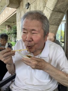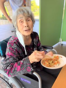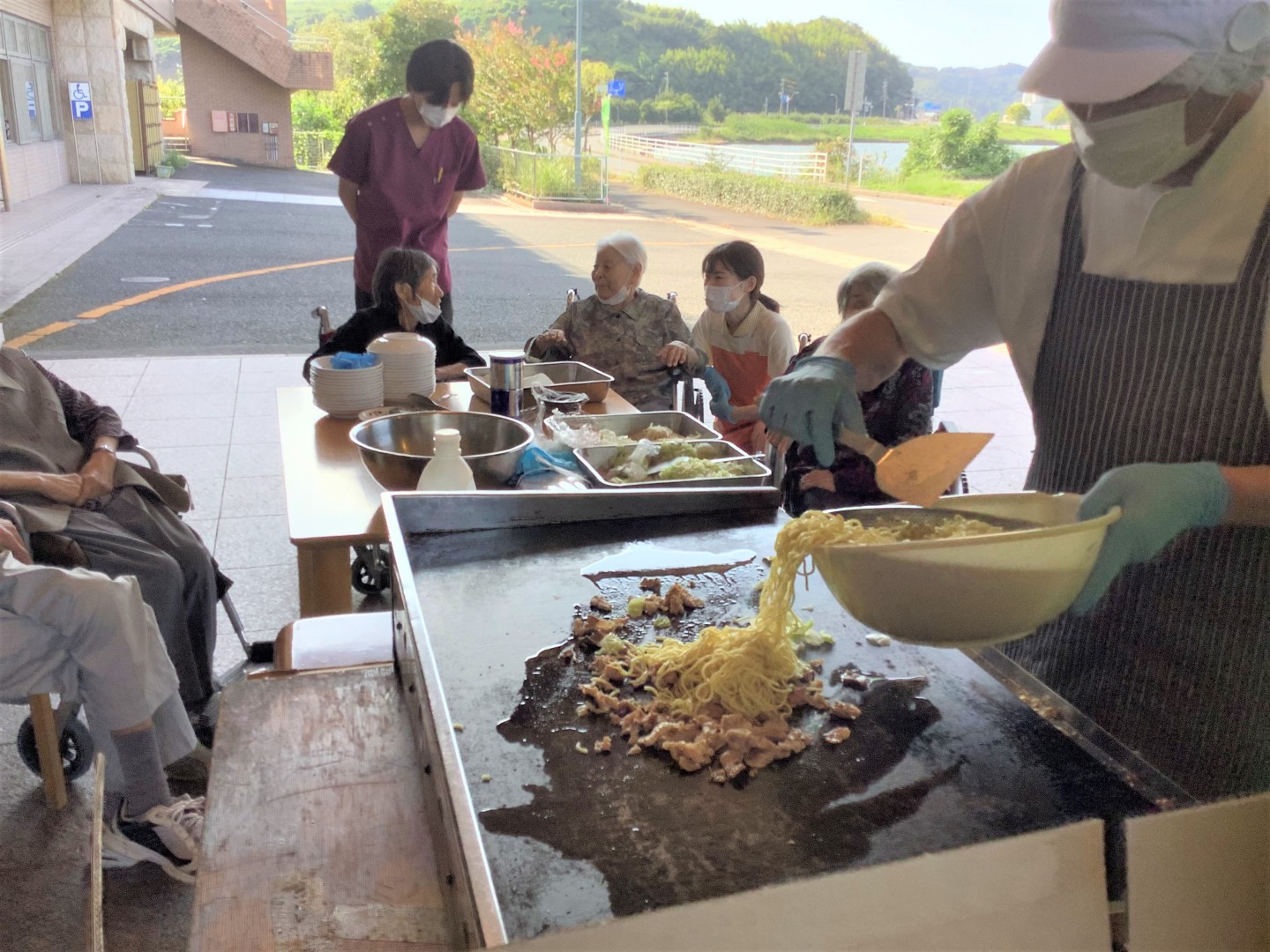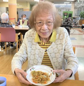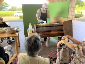 9月30日厨房職員による調理でやきそばをいただきました。天気も良く屋外での調理に、辺りには焼きそばソースのいい香りがし、厨房の職員の手際に「上手だねぇ。」と褒めて下さるご利用者もおられました。