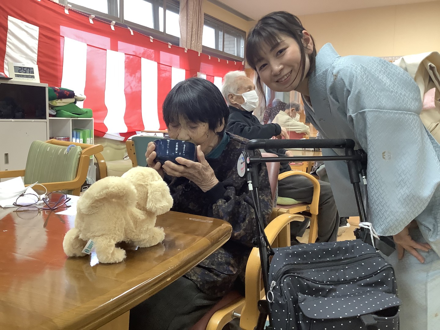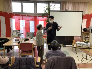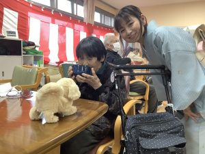 1月21日通所リハビリで新年会行事を開催しました。職員の出し物やお茶を点ててご利用者に振る舞いました。「とても楽しかったです。」と喜んでいただけた会となりました。