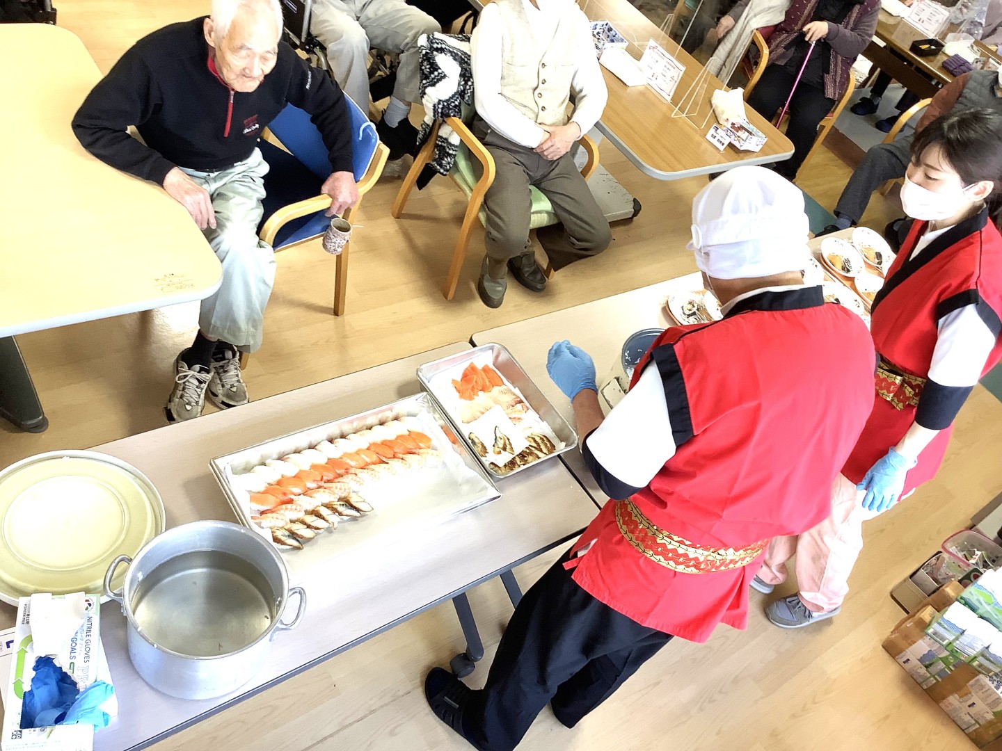 2月26日厨房職員による握りずしの実演が行われました。