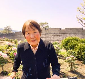花の前で笑顔でピース。