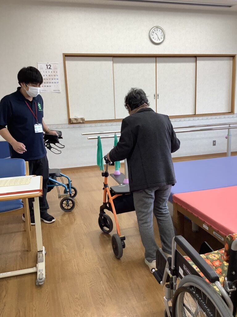 こちらご利用者は歩行器や杖を使用して歩くことを目標にリハビリを励まれています。