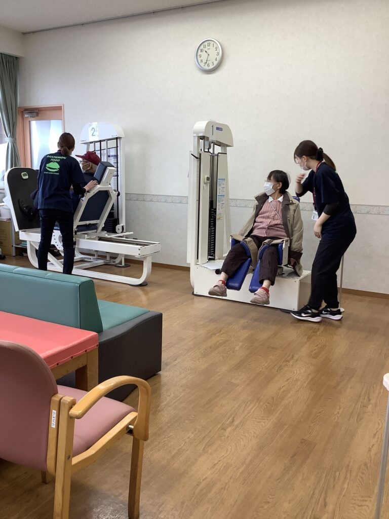 リハビリスタッフの指導を受けた介護スタッフがリハビリスタッフが行うリハビリ以外に職員も運動の実施に努めています!