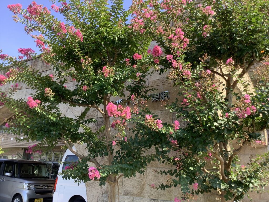 サンテリオン東郷玄関周辺にサルスベリの花がピンクに花を咲かせ見頃を迎えています。