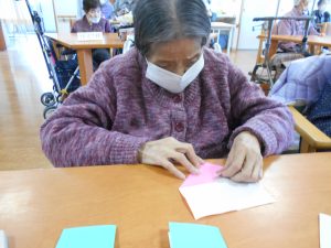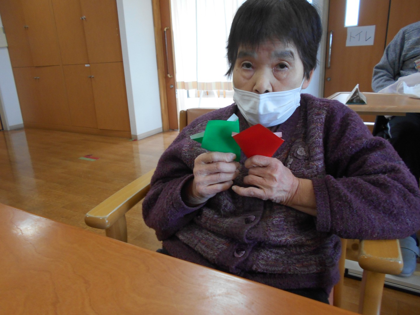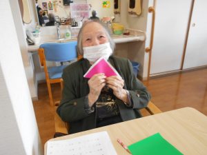 HOME > 新着情報 > お知らせ > ひな人形づくり ガーデンハウス野花 ひな人形づくり ガーデンハウス野花 2023/03/10 お知らせ 折り紙でひな人形作りをしました。 「どがにいして折る?あんたデコ描いていな」 と言われながらも自身で笑いながら顔を描かれました。 皆さん個性的なひな人形と桃の花ができました。 投稿ナビゲーション 次のページ前のページ 一覧に戻る