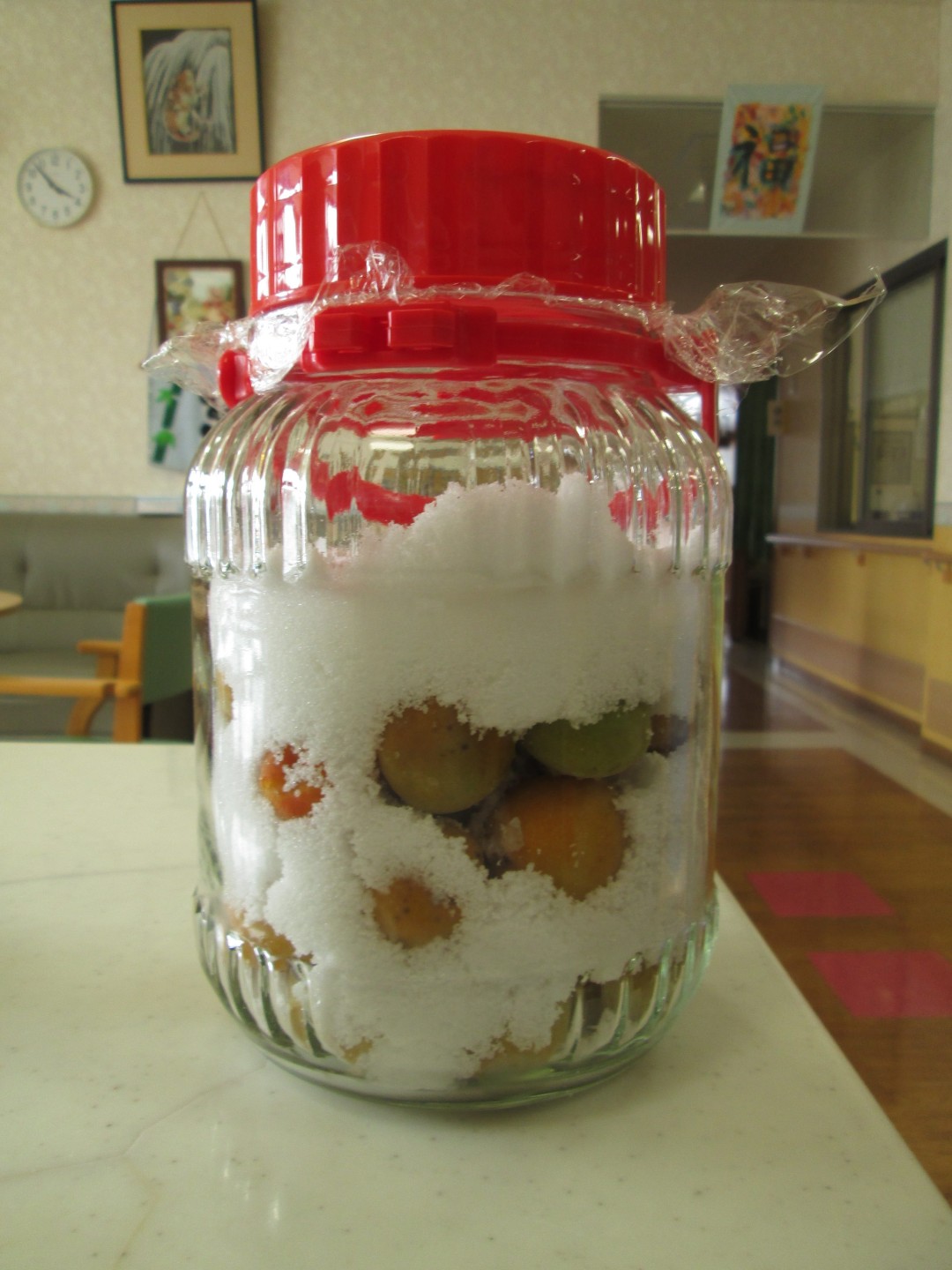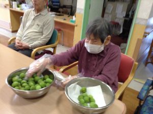 梅ジュース作りをしました。きれいに洗って水分を拭き取り乾かします。
