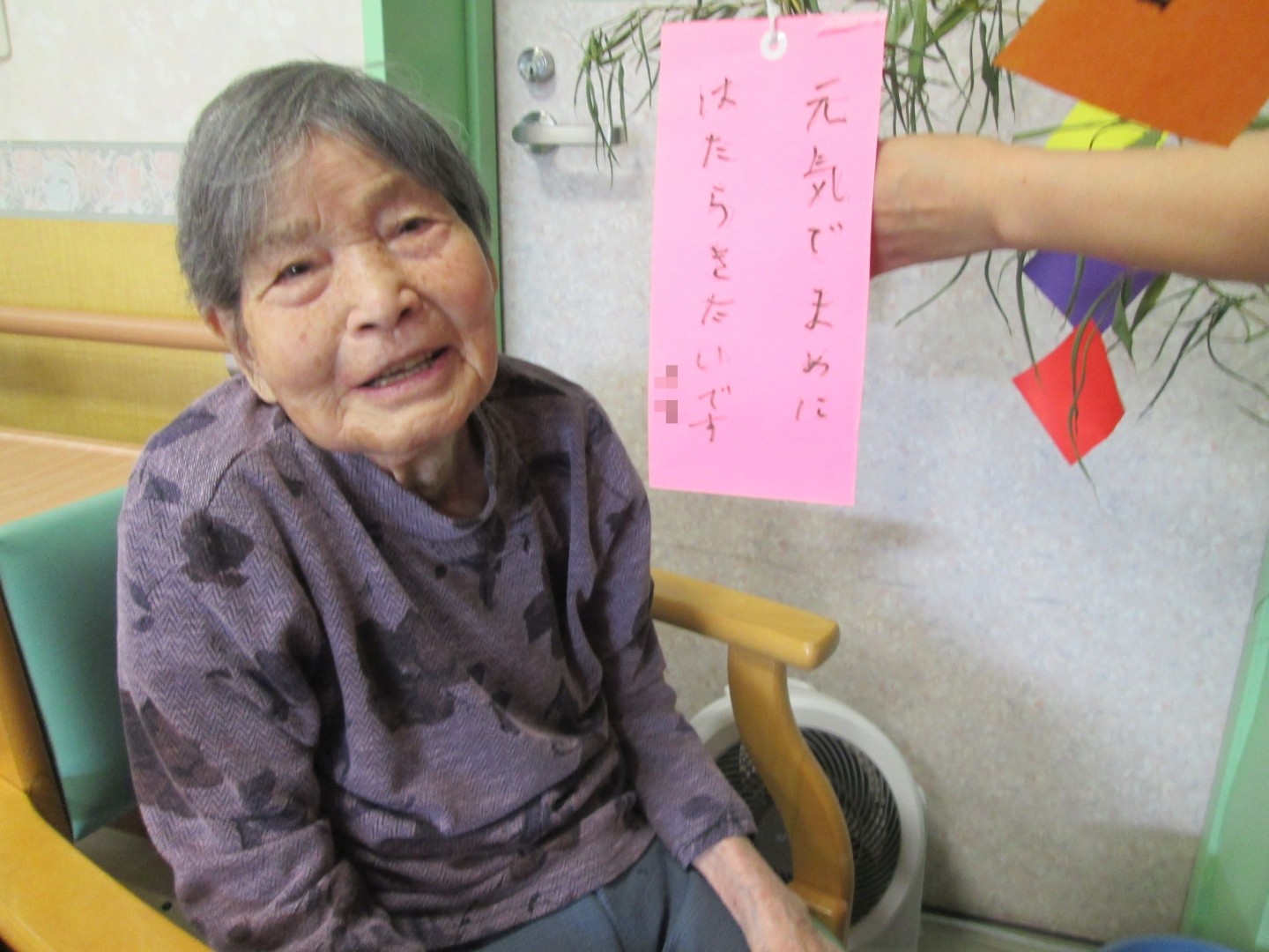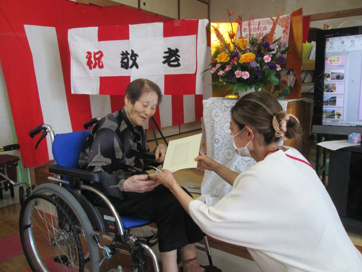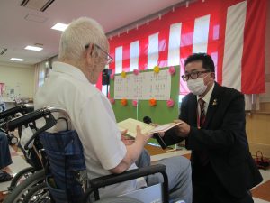 9月17日に老健と合同の敬老会式典を開催しました。管理者、施設長よりお祝いの言葉やメッセージカード授与を行いボランティアさんによるウクレレショーを観賞し楽しみました。