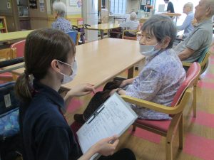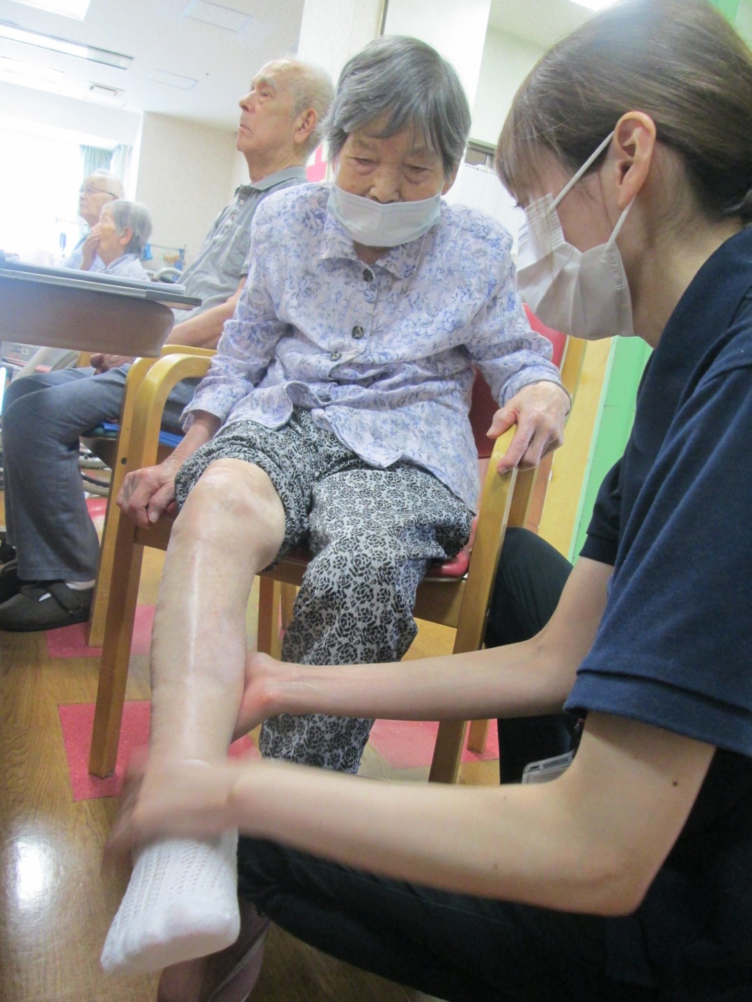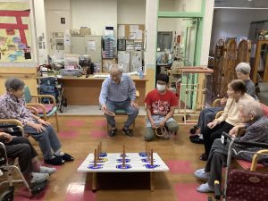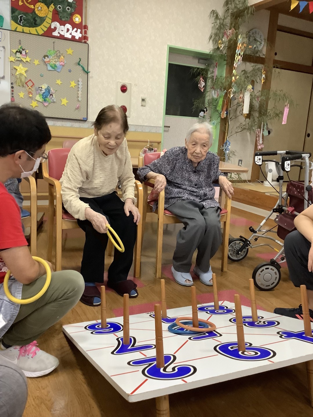 輪投げをして体を動かしました。「小さい頃にやったな」と昔を思い出しながらされていました。近くの的を狙う方や遠くの高得点の的を狙って投げられる方があり、とても盛り上がりました。
