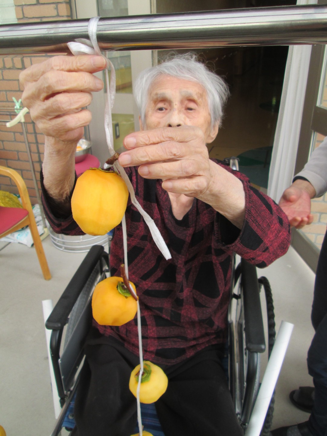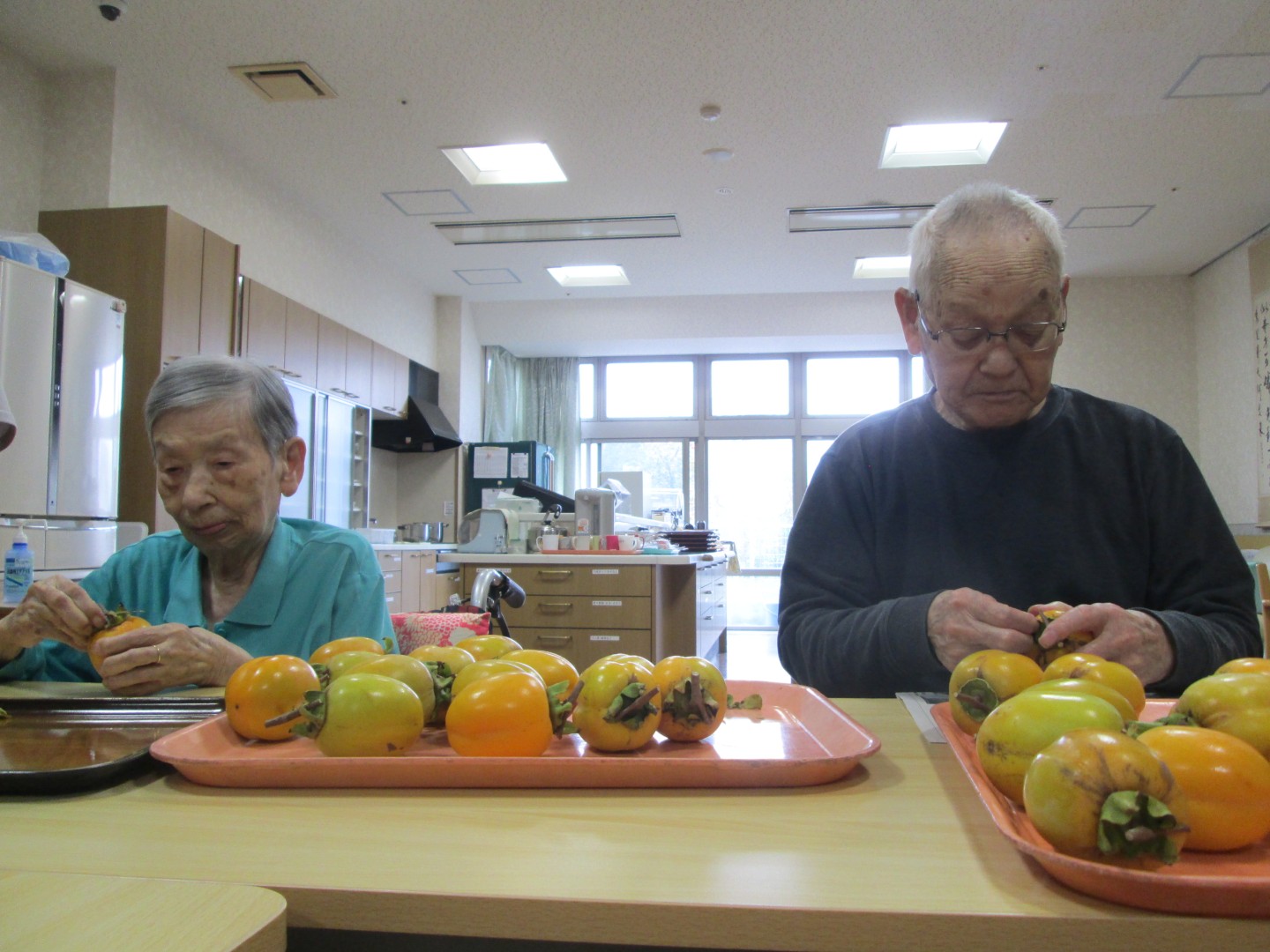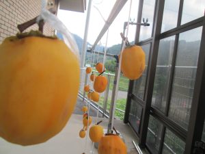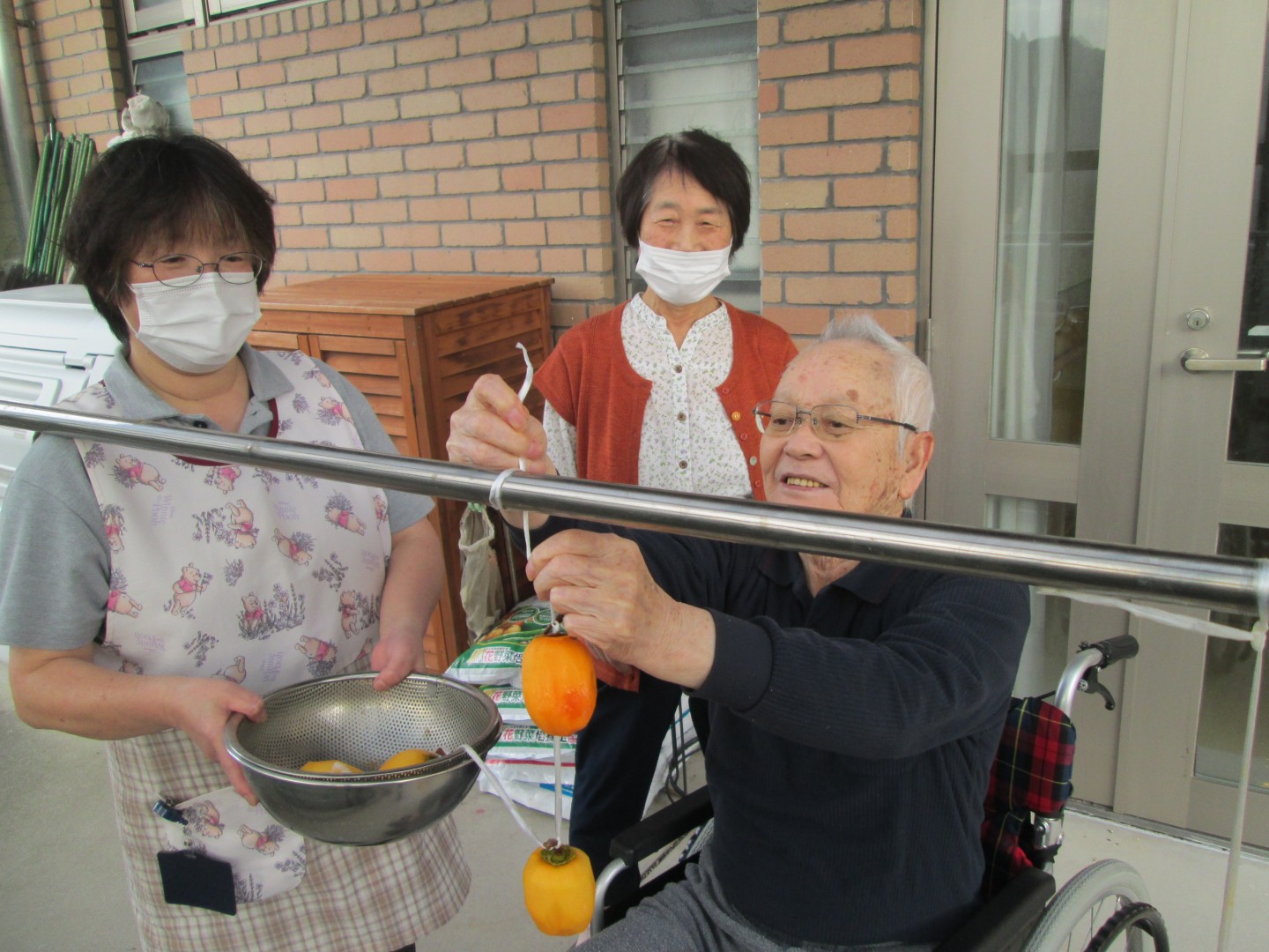 11月初旬に干し柿作りを行いました。「いい柿だなー」「昔よく作りよったよ」と会話が弾み慣れた手つきで作業されていました。干してから1週間後には柿を揉みました。 「早く食べたい」と完成が待ちきれません。