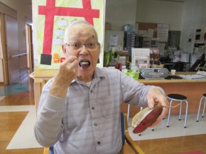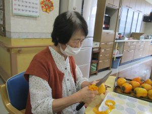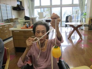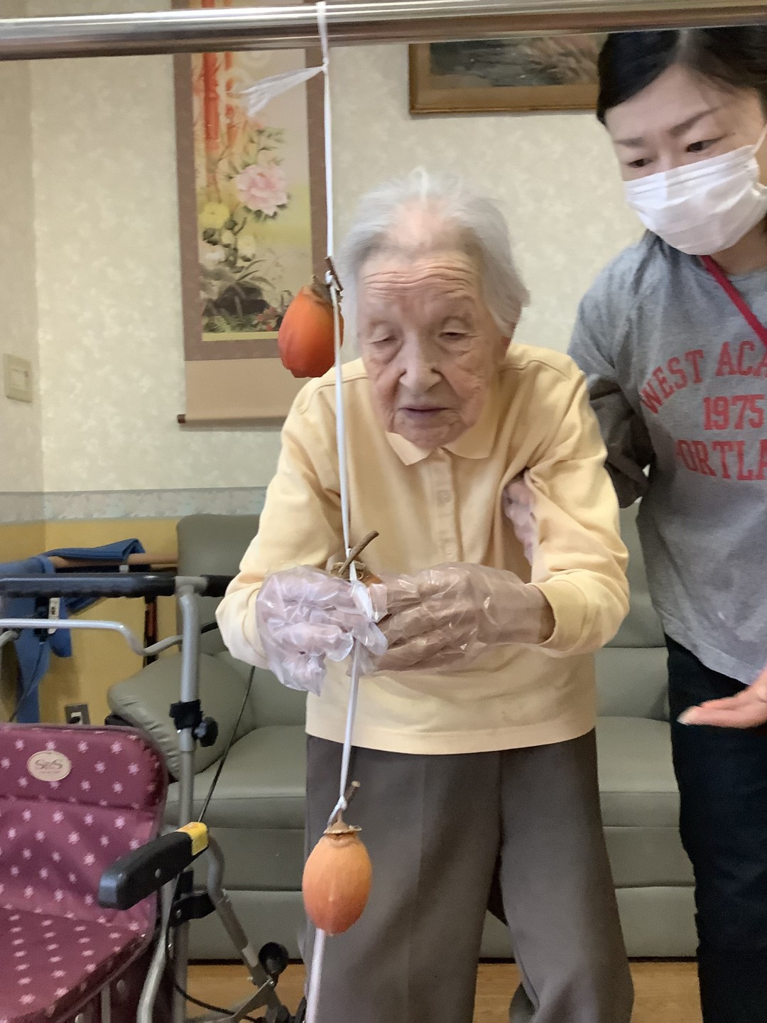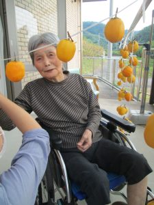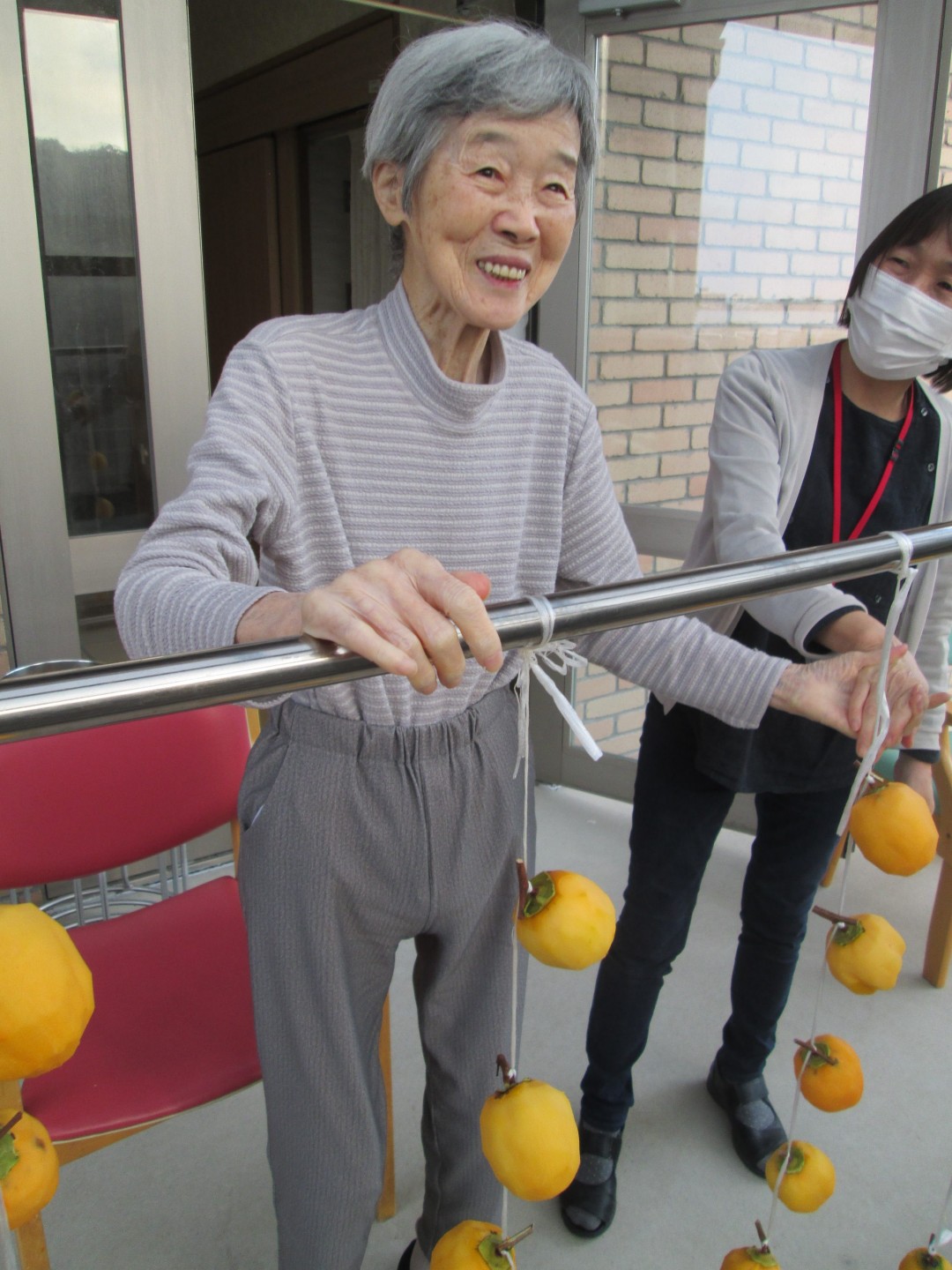 11月初旬に干し柿作りを行いました。「いい柿だなー」「昔よく作りよったよ」と会話が弾み慣れた手つきで作業されていました。干してから1週間後には柿を揉みました。 「早く食べたい」と完成が待ちきれません。
