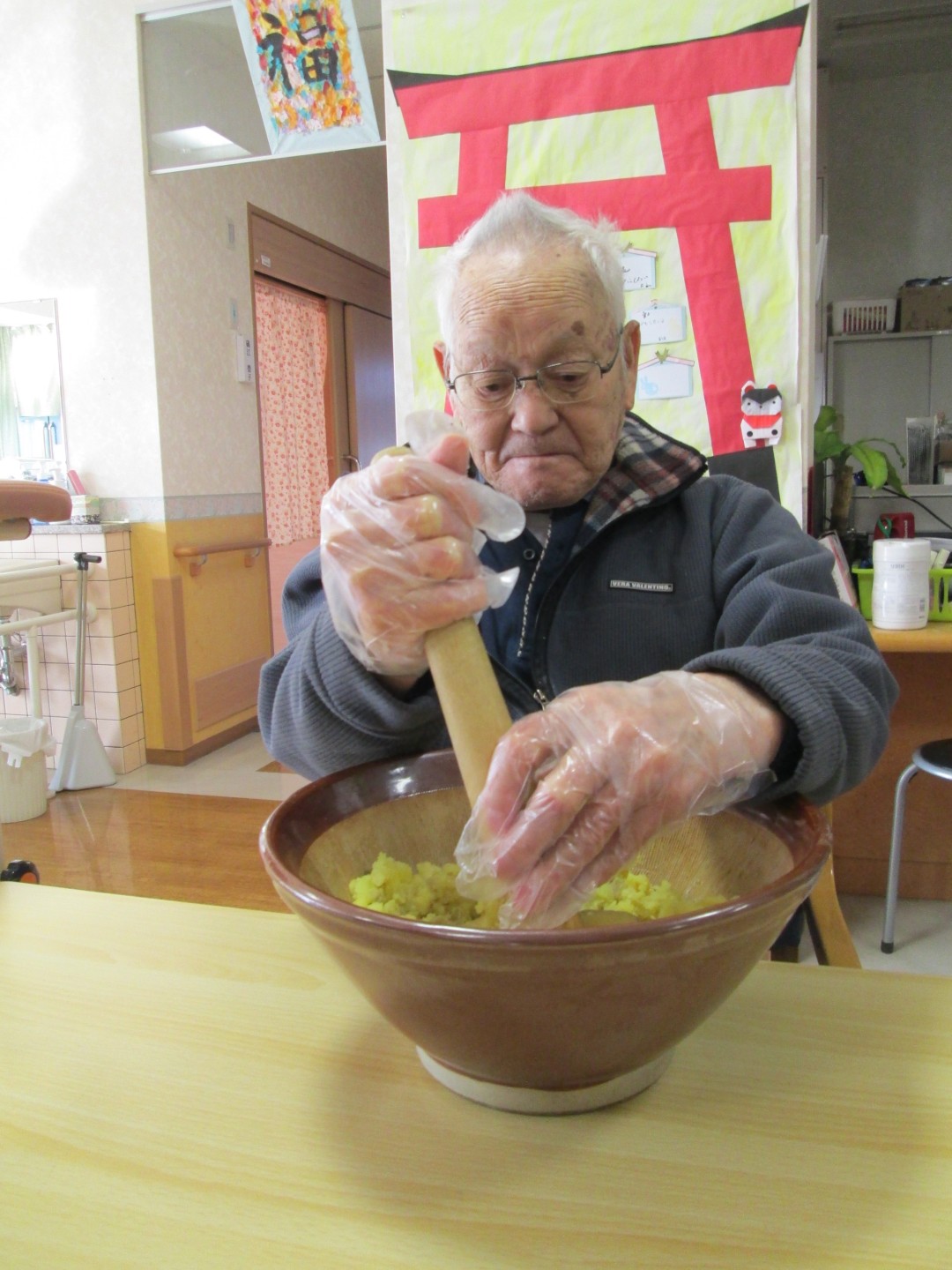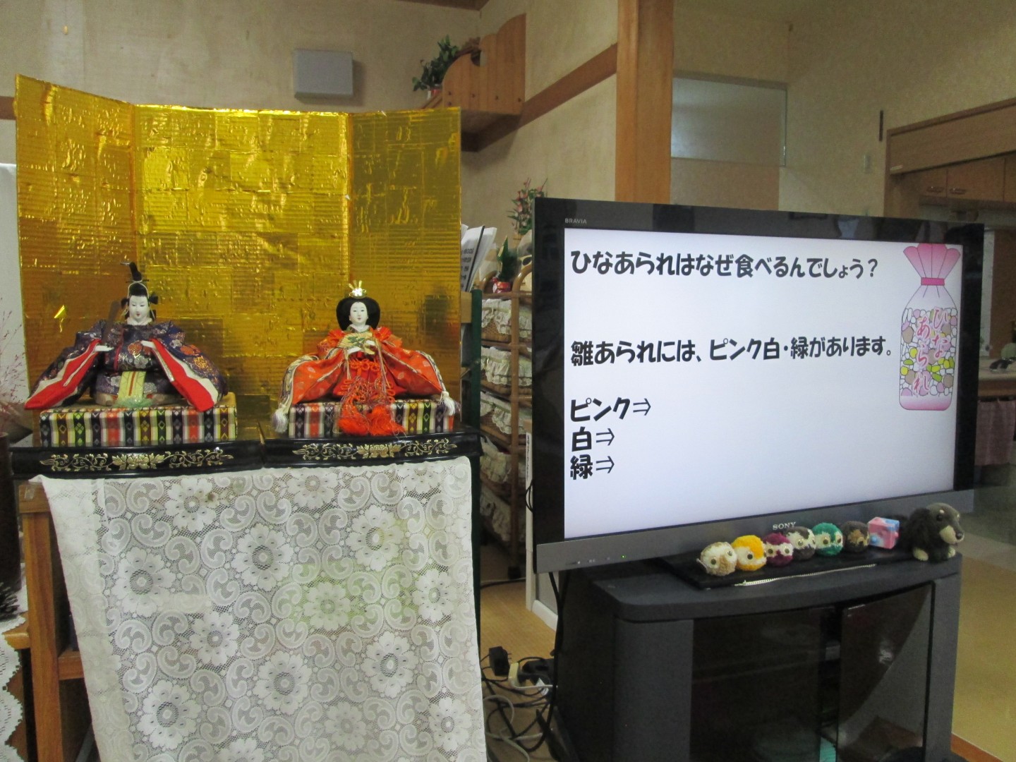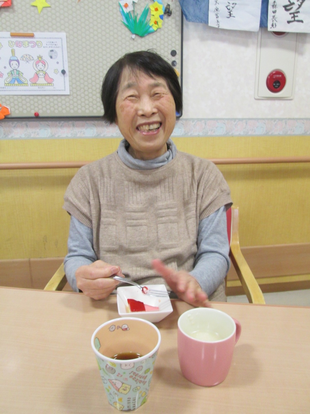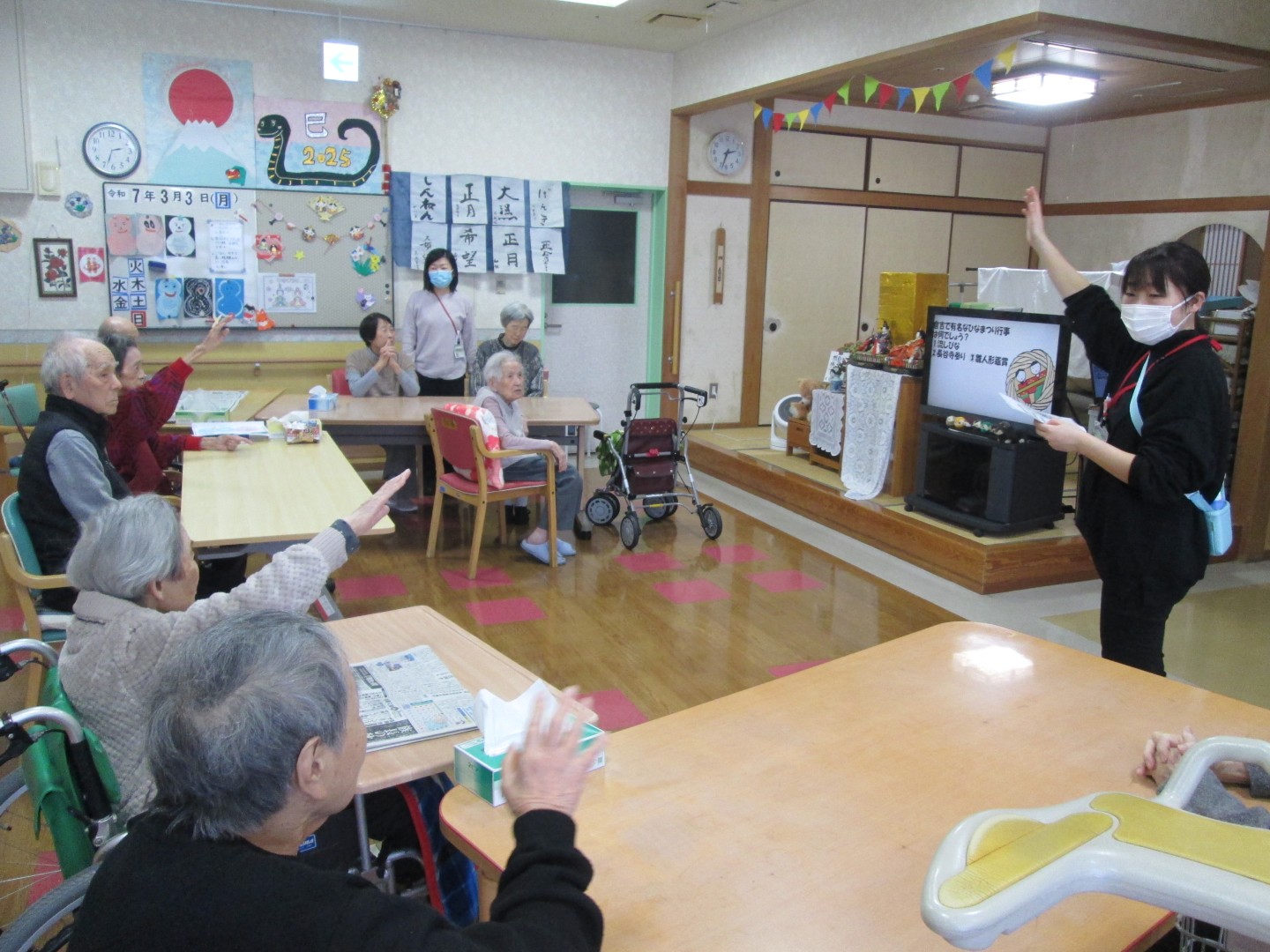 3月3日にひなまつり行事を行いました。ひなまつりに関するお話やクイズゲーム、ひなまつりの歌を皆様で歌いました。おやつにはムースケーキと甘酒を召し上がられ「久しぶりに甘酒を飲んでおいしかった」と甘酒に酔いしれていました。