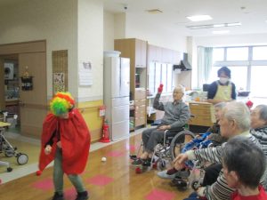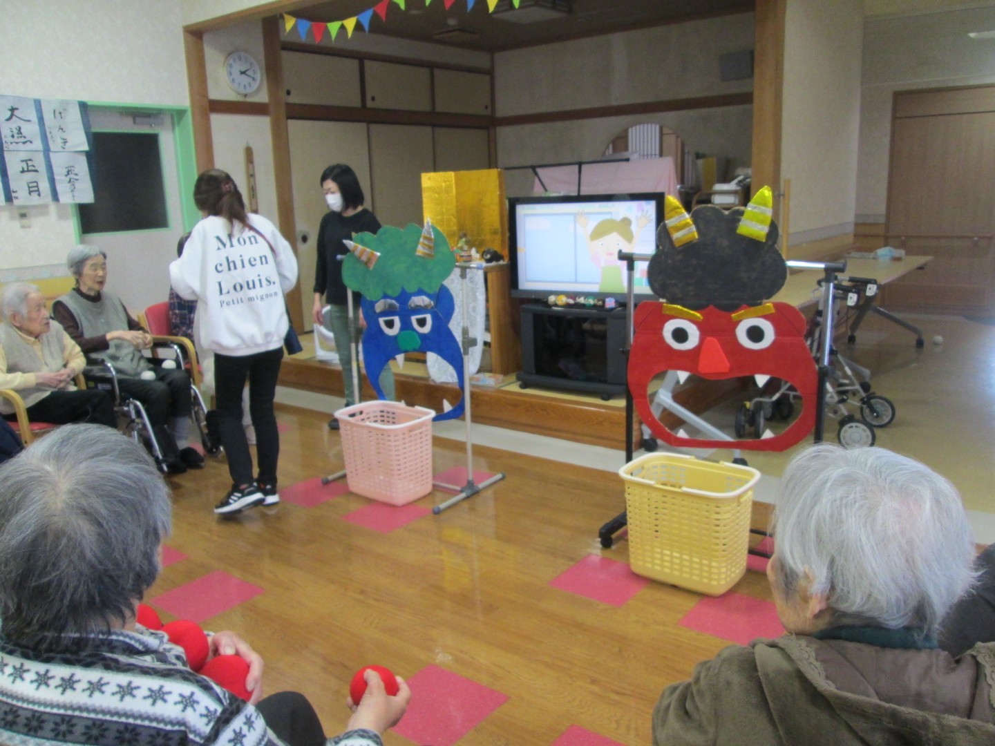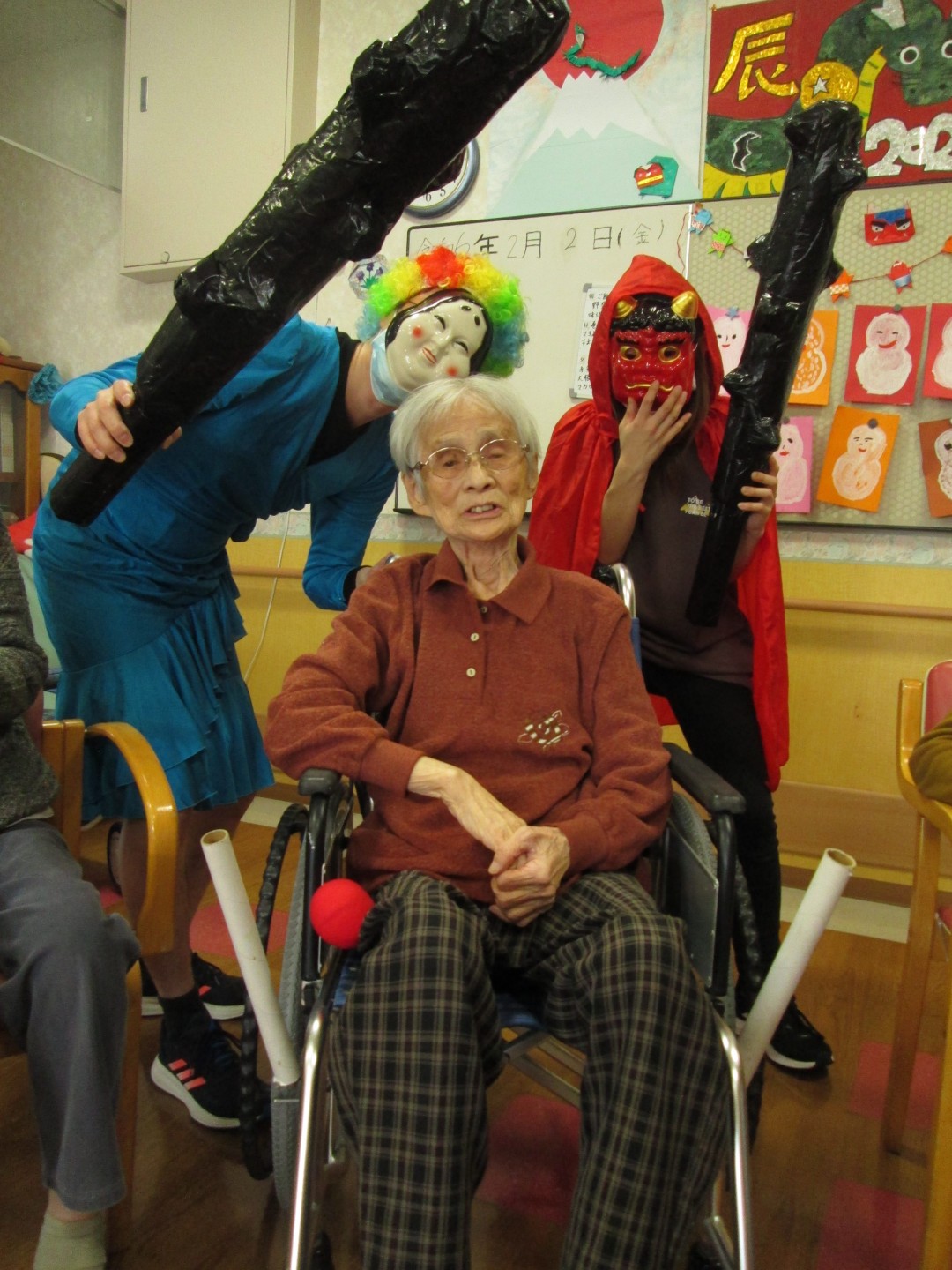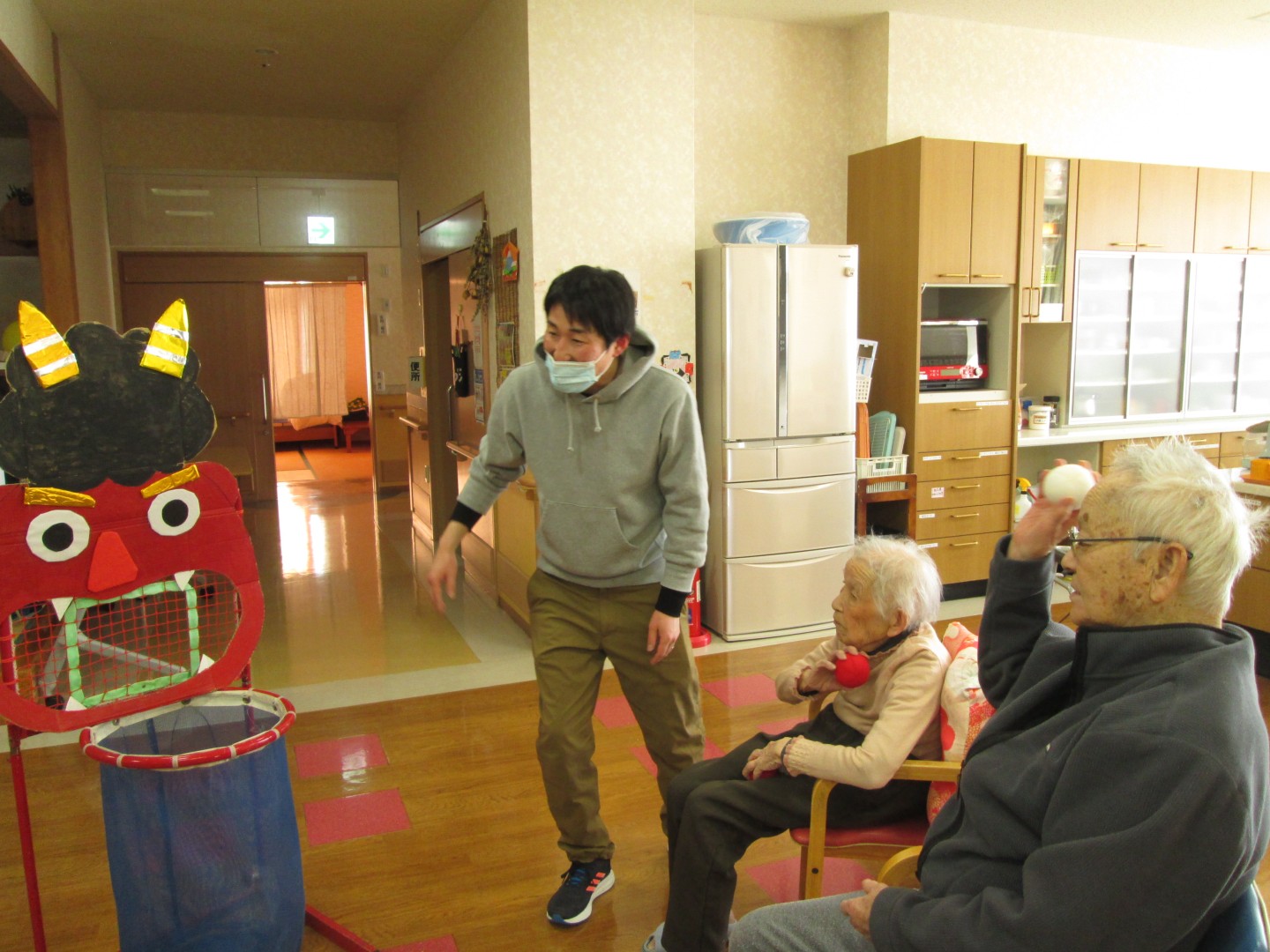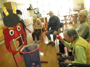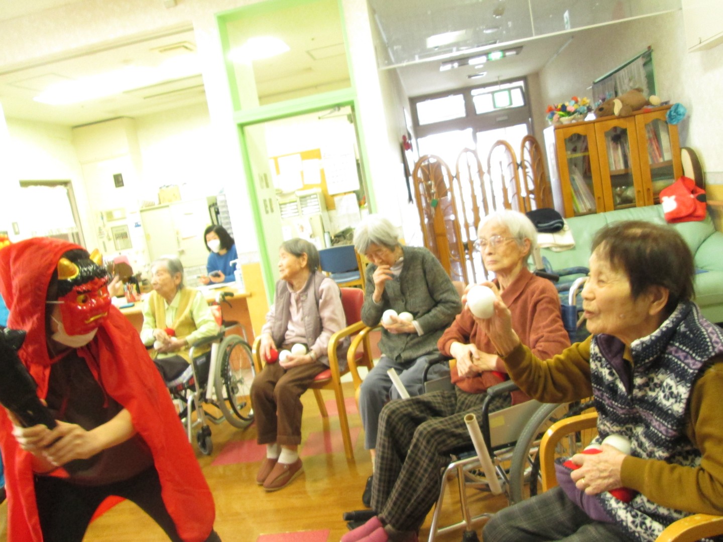 2月3日に節分行事を開催しました。当日は赤鬼に扮した職員が登場すると、参加者からは驚きの声が上がりました。元気なかけ声とともに「鬼は~外、福は~内」と紅白玉を力いっぱい投げ鬼を追い払いながら、一年の無病息災を願いました。最後には、節分の縁起物である恵方巻にちなんで皆さんでロールケーキをいただき、今年の福を願いながら楽しいひと時を過ごしました。