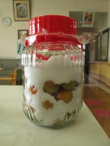 乾いたら、「美味しくなーれ」と砂糖と一緒に瓶に詰めました。