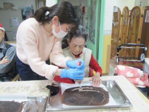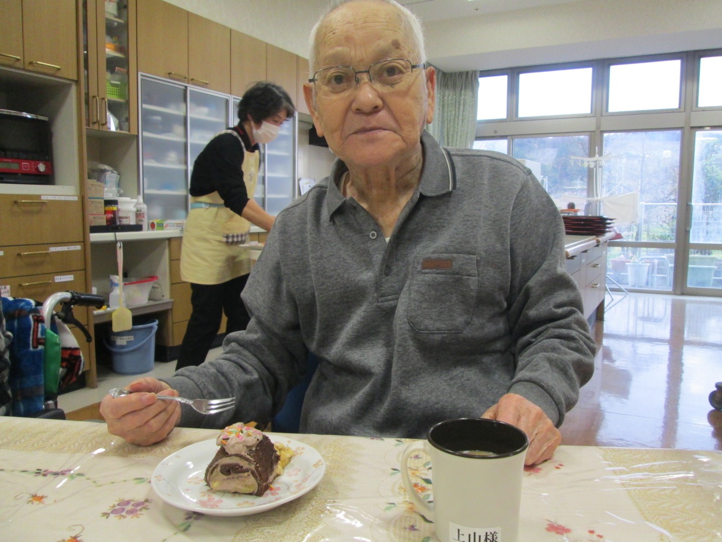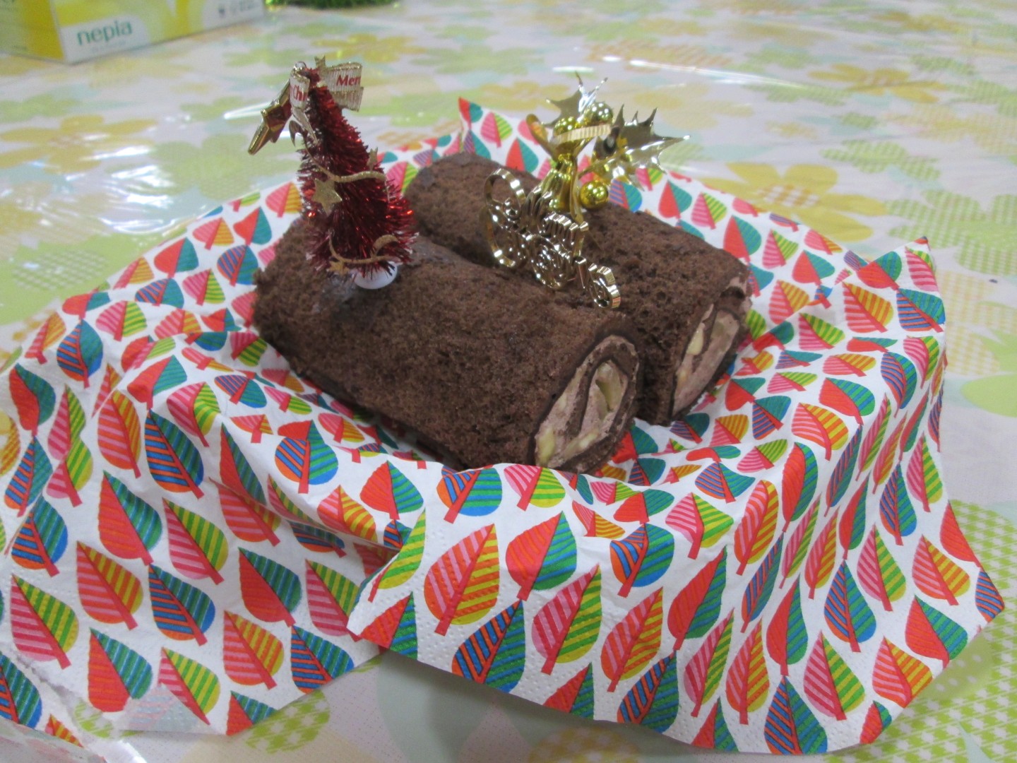 12月26日にクリスマス会をしました。「今年はチョコレートケーキが食べたいな」と、希望がありチョコロールケーキを作りました。みんなで作ったケーキを食べながらスライドショーを見て1年を振り返りました。