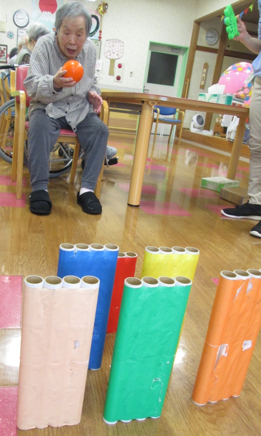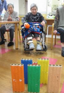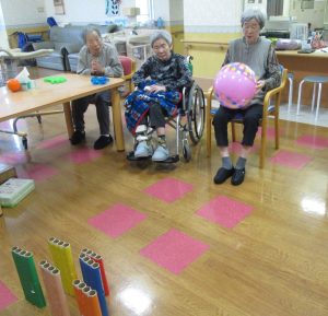 レクリエーションでは、ボウリングを行いました。利用者の皆さん、投球に集中する姿や「もう一回!」と挑戦する姿が印象的で、応援の声も飛び交いました。