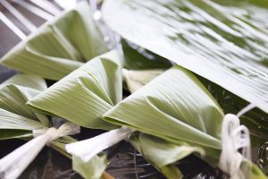 笹の葉に団子を巻く作業まで一緒に手伝ってもらいました。