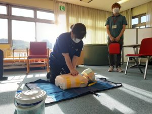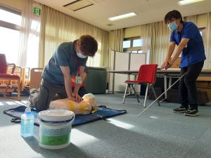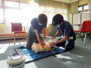 HOME > 新着情報 > お知らせ > 心肺蘇生訓練 心肺蘇生訓練 2023/08/25 お知らせ 応急手当普及員の資格を持つ職員が講師となり、 心肺蘇生用のモデルとAEDシミュレーターを使用して 心肺蘇生法の研修を行いました。 胸骨圧迫を実施する際の注意点や AED使用時の注意点について説明したほか、 新型コロナウイルス感染対策を講じたうえでの 心肺蘇生法についても説明と実技を実施しました。 投稿ナビゲーション 次のページ前のページ 一覧に戻る