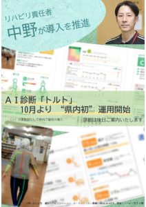 HOME > 新着情報 > お知らせ > AIによる歩行および口腔機能解析システム【トルト】を導入します① AIによる歩行および口腔機能解析システム【トルト】を導入します① 2023/09/26 お知らせ AIにより動画解析を行う「トルト」を 介護施設としては鳥取県内で初めて導入します。 詳細は来週以降ホームページでもお伝えしていきます。 クリックすると拡大します 投稿ナビゲーション 次のページ前のページ 一覧に戻る