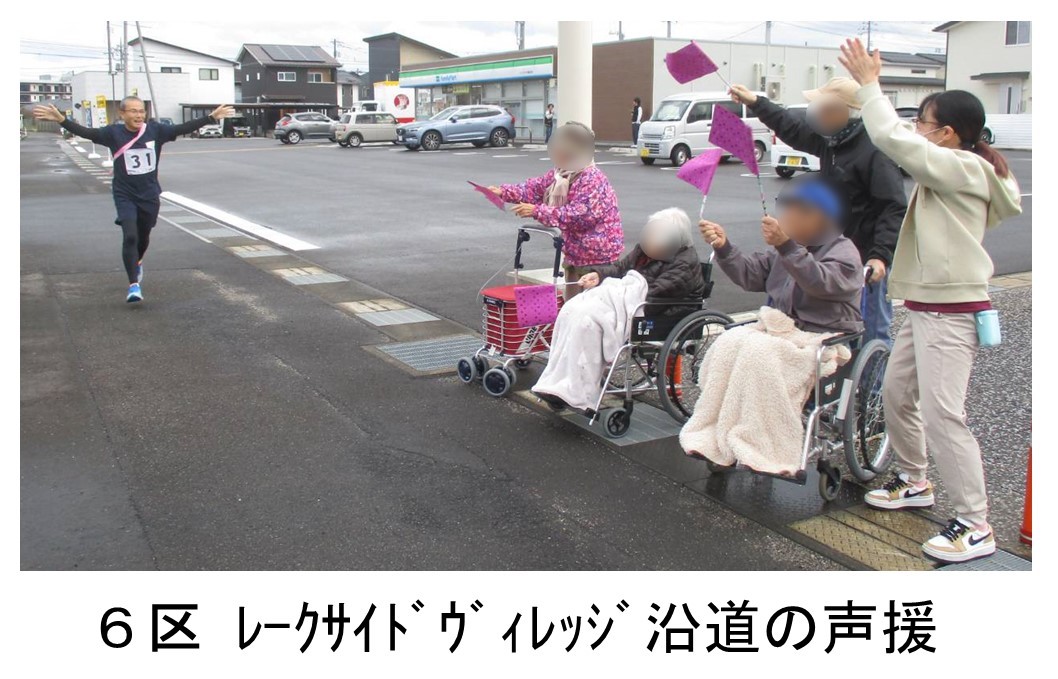 6区は、めぐみの湯公園までの1.6㎞を、途中、グループホームゆりはま、ゆりはま大平園のご利用者、職員の声援にも背中を押され、本人も驚きの過去最高タイムで走り抜けました。