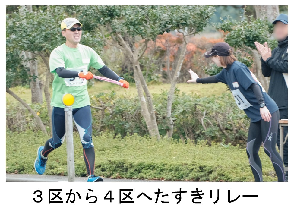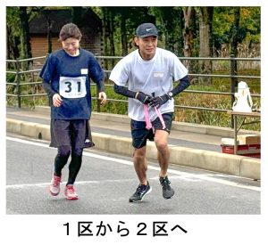 3区は、東京マラソンをはじめとしたフルマラソンを何度も完走しているいぶし銀の選手です。2区とは、うって変って夢広場駐車場までのほぼ下りかつ区間最長2.3㎞のコース。濡れた落ち葉に足を滑らせながらも部門区間賞の力走をみせました。