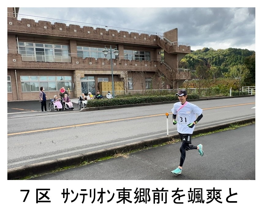 7区アンカーは、普段から走りこんでおり、終始、軽やかな走りで、サンテ東郷前の大声援にも笑顔で応える余裕もみせ、東郷支所裏駐車場のゴールに飛び込みました。