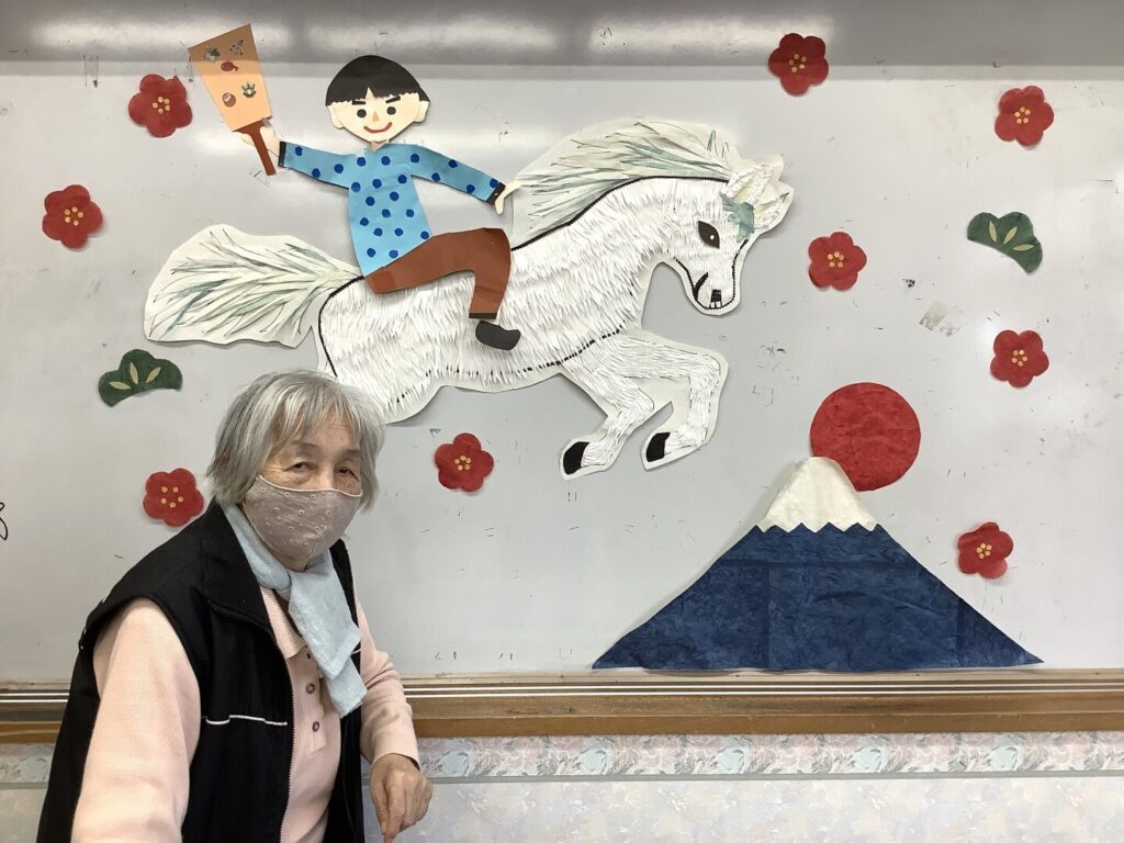 リハビリ室では、毎年恒例として干支の作品を掲示しています。今年の干支は「午(うま)」です。昨年12月より、通所リハビリの利用者さんと職員が協力し、色や素材、形について意見を出し合いながら制作を進めてきました。皆さんの想いが詰まった、一つの作品が完成しました。