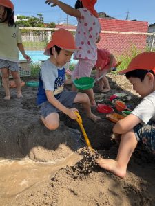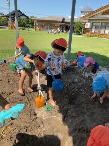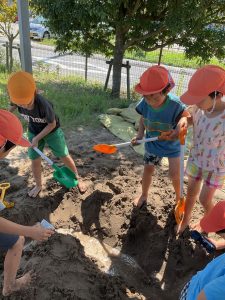 新着情報 2025.09.26 泥んこ遊び、楽しかったよ!【くま組】 砂場で泥んこ遊びをしようか?と声をかけると、「やった~!早く遊びたい!」と、大喜びのくま組さん! それぞれで道を掘り、途中で「道、繋げよう?」と、声をかけて道を繋げたり、その道に水が流れるにはどうしたらいいのか話し合ったり、考えたりして「もう少し、ここを掘ったらいいんじゃない?」と、自分たちで工夫をしながら楽しんで遊びを充実させている姿が見られました! 前へ 一覧へ 次へ