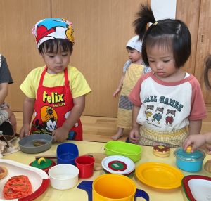 新着情報 2025.09.26 おままごとだいすき!【うさぎ組】 おままごとをして遊ぶことが大好きなこどもたち! エプロンや三角巾を付けて、ごちそうを作って楽しみました☆ エプロンをつけると嬉しくてニコニコな表情を見せてくれましたよ~😊 前へ 一覧へ 次へ
