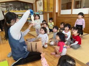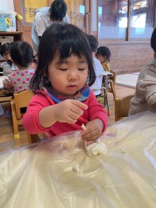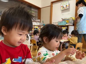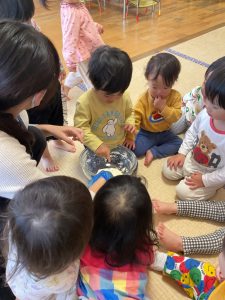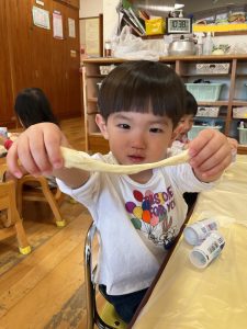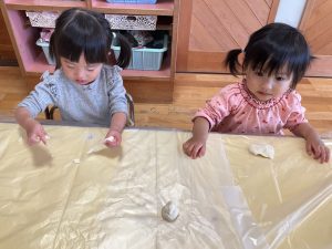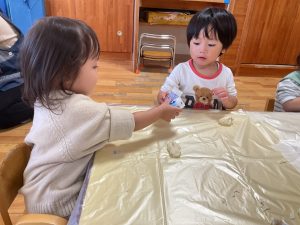 新着情報 2025.10.31 小麦粉粘土で遊んだよ♩【うさぎ組】 お部屋で小麦粉粘土遊びをしました。子どもたちの目の前で作る様子を見せると、「なになに~?」「すごーい」と興味津々に小麦粉粘土ができる様子を楽しんでおられました。 実際に触って見るとひんやり冷たくて、ちょっとねばねばしたりもちもちしたりする感触に笑顔の子どもたちでした。 ちぎったり、丸めたり、伸ばしたりと色々な形にして楽しく遊びましたよ🎵 前へ 一覧へ 次へ