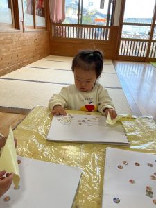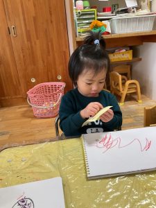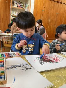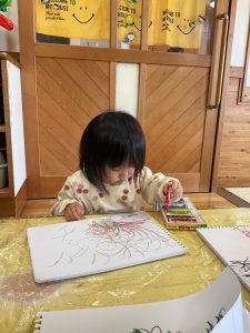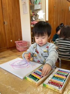 新着情報 2025.12.23 お絵描きとシール貼りをして遊んだよ!【うさぎ組】 お絵描きやシール貼りをして指先を使って遊ぶことを楽しんでいます。 色が分かるようになり、クレヨン見せながら「あか~」「あおだよ~」と教えてくれる子どもたちです😊時には「どんな色が好き」の歌を歌いながらノリノリでお絵描きを楽しんでいますよ~♪ シールを貼ることも上手になってきており、指先を使って上手に遊んでいます✨寒くて戸外遊びができない時も室内で楽しく遊んでいきたいと思います! 前へ 一覧へ 次へ
