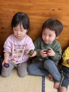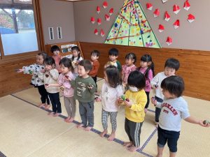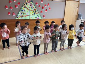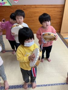 新着情報 2025.12.23 楽器で遊ぶの楽しいね♪【りす組】 タンバリンやエッグシェイカーを使って楽器遊びをしました。 “おもちゃのチャチャチャ”や”あわてんぼうのサンタクロース”の曲に合わせて楽器を鳴らしたり、歌を歌ったりと表現することを楽しんでいましたよ♬ 前へ 一覧へ 次へ