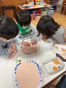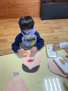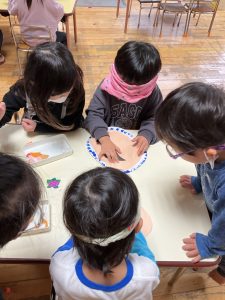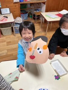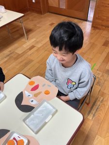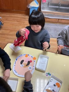 新着情報 2025.12.25 福笑いをしたよ!【ぱんだ組】 新年に向けて、福笑いを作りました!自分でパーツを作り、オリジナルの福笑いを作りました。 パーツができたところで、いよいよ福笑い大会☺ お正月を先取りし、みんなでできあがった顔を見ながら大笑いしました! 来年も笑いたっぷりの一年を過ごせますように☆✨ 前へ 一覧へ