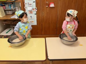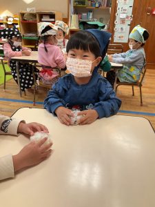 塩とゆかりで好きなおにぎりを自分でにぎり、「できた!」とみんなで見せ合いましたよ。