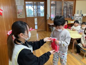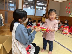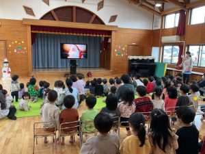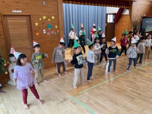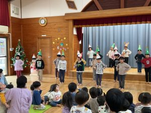 新着情報 2025.12.26 クリスマス会がありました! 子どもたちが楽しみにしていたクリスマス会がありました。みんなで「あわてんぼうのサンタクロース」の歌を歌ったり、「クリスマスって何だろう?」のクイズをしたりして楽しみましたよ☺サンタさんからのビデオメッセージに子どもたちは大喜びでしたよ。 くま組さんは、クリスマスの素敵な踊りを披露してくれました!くま組さんの踊りにみんな大盛り上がりでした! クリスマスプレゼントをもらいニコニコ笑顔の子どもたちでした! ツリーとスノーマンの前で写真も撮りましたよ☆ 前へ 一覧へ 次へ