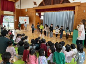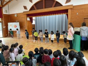新着情報 2026.01.07 保育はじめ・新年お楽しみ会がありました! 新しい年を迎え、笑顔いっぱいで登園してきた子どもたち。 「あけましておめでとうございます」と元気いっぱいのあいさつで新年がスタートしました。 新年お楽しみ会では、お正月にちなんだクイズを行い、お正月にしめ縄を飾ること、おせち料理を食べることなどを知りました。 また、お正月遊びの紹介ではくま組さんが、けん玉とコマを披露してくれました。保育者が手の上でコマを回すと、子どもたちの大歓声があがりました。とても楽しい雰囲気の会となりました。 前へ 一覧へ