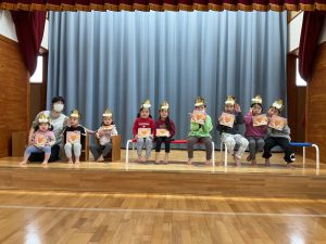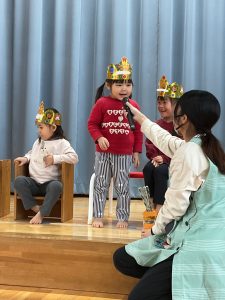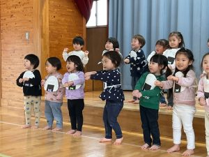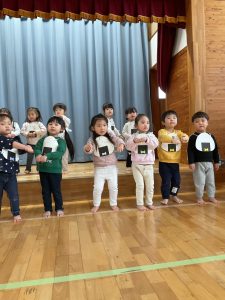 新着情報 2026.01.19 1月のお誕生会をしました! 1月のお誕生会をしました。 『好きな色』『好きな遊び』などの質問に緊張しながらも、うれしそうに答える姿が見られました。 りす組さんがおにぎりに変身し、”のりのりおむすびくん”を踊ってお祝いしてくれましたよ♪ 前へ 一覧へ