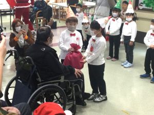 発表のあとは、園児さんから心のこもった手作りリースのプレゼントが贈られ、受け取ったご利用者は「かわいいね」と嬉しそうに眺めておられました。