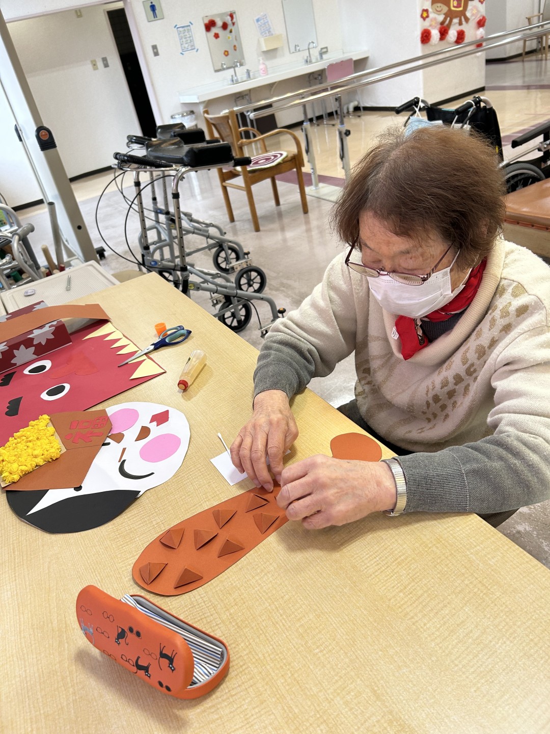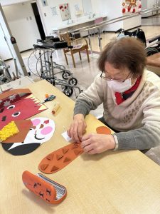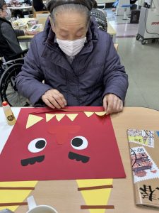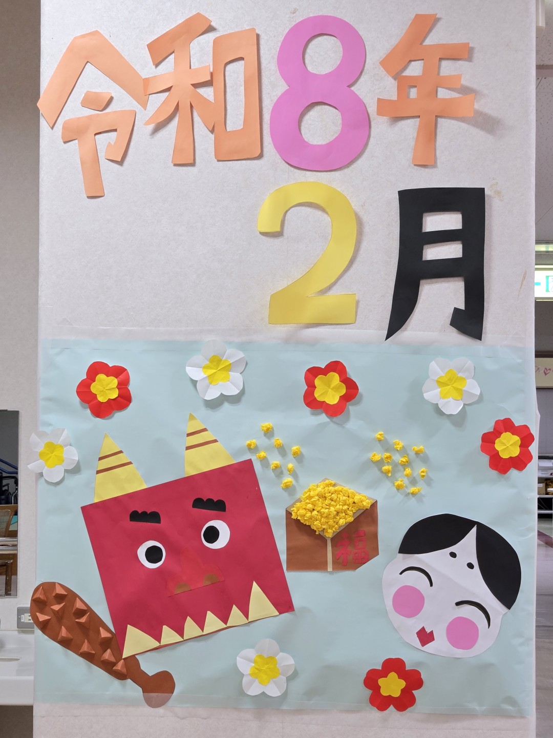 新着情報 2026.02.25 通所リハビリ2月壁画完成~節分~ 通所リハビリでは、2月の「節分」に合わせて壁画制作を行いました。 利用者様それぞれが思い思いに工夫を凝らし、個性豊かな作品が完成しました。 色鮮やかな鬼や、やさしい表情のお福さんなど、どの作品も温かみがあり、眺めているだけで心がほっと和みます。 完成した壁画を皆さまで鑑賞しながら、自然と笑顔が広がるひとときとなりました。 これからも季節を感じられる活動を通して、楽しい時間を共有してまいります。 前へ 一覧へ