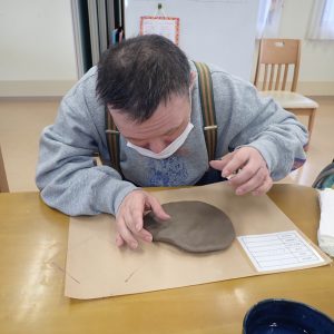 陶芸体験は初めての利用者さん達、真剣に作り方のレクチャーを受けています。