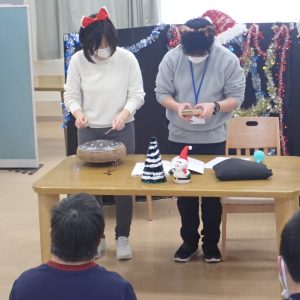 新着情報 2025.12.24 【日中一時】クリスマス会 クリスマス会を開催しました。 職員による「タングドラム」「カリンバ」という楽器の演奏やマジックショー。 仮装しての写真撮影などで楽しみました。 演奏会スタートです タングドラムとカリンバ 体験してみます カリンバにもチャレンジ 前へ 一覧へ