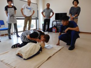 このたびは、湯梨浜消防署の救急救命士の皆さんに講義頂き、その後に参加者全員が救急処置を実際に行いました。
