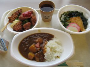 東郷湖一周ドライブの後、昼食はうどん、焼き鳥、フランクフルト等の屋台を準備。