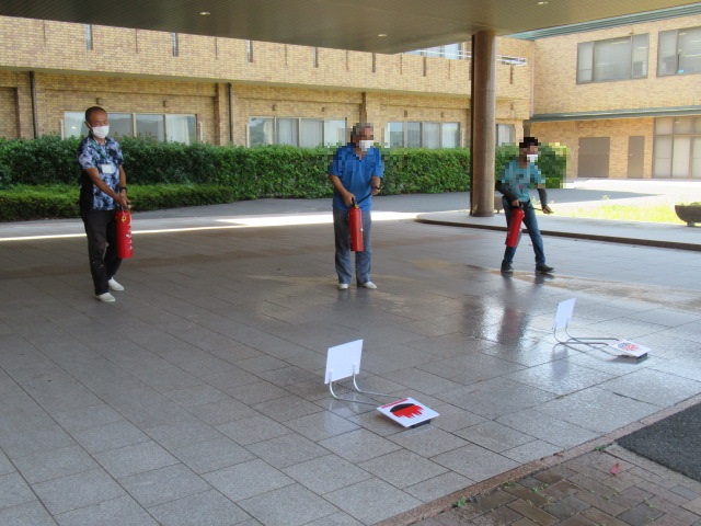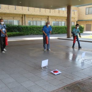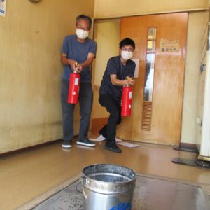 避難訓練終了後には、水消火器を使用した消火訓練もおこない、消火器の使い方を習いました。