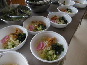 ガスボンベで湯を沸かし、熱々のうどんが出来上がると、