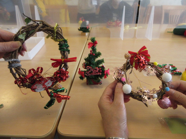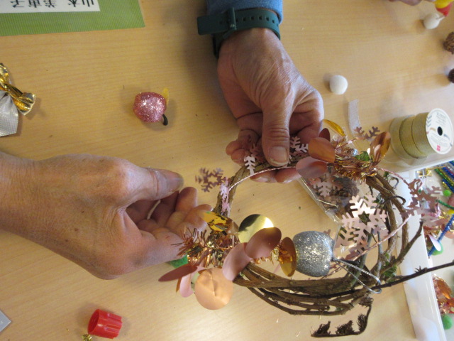 クリスマスリースに最初は興味がなかったご利用者も段々と熱中され、リボンやまつぼっくりなどを貼り付ける場所にこだわりを見せられる方もいらっしゃいました。