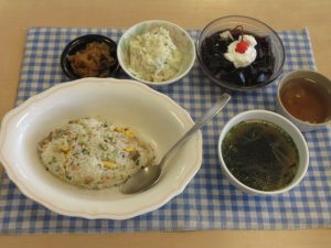 メニューはチャーハン、ワカメスープ、ポテトサラダ、漬物・・・