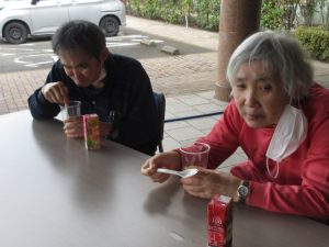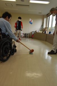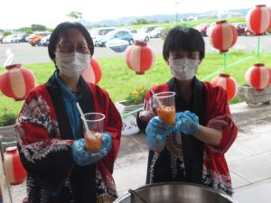 ジュースのつかみ取り、フルーツポンチの提供やグラウンドゴルフ体験を行いました。