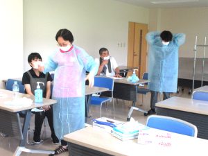 手指消毒の方法やPPE(個人防護服)の着脱の再確認を行いました。