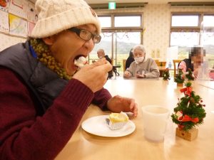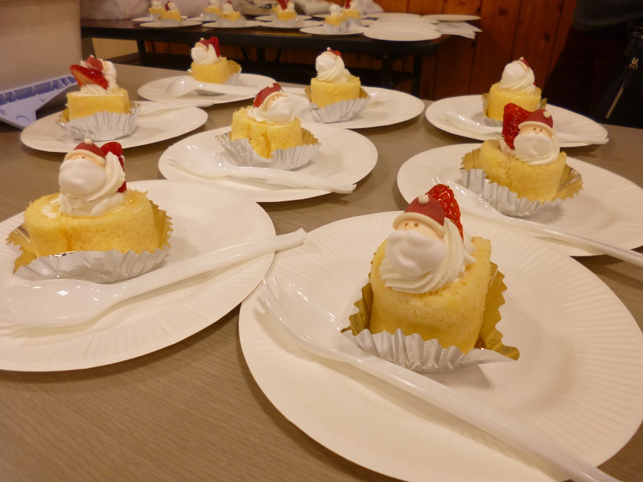 茶話会では特注のケーキ。かわいいサンタクロースの飾りは喜ばれました。