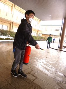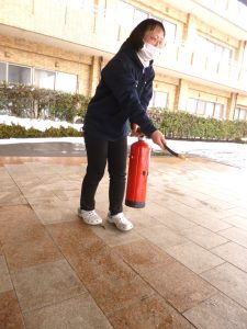 避難訓練後は水消火器を使って消火訓練を希望者が行いました。