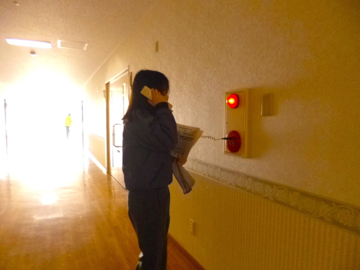 説明後は、避難訓練です。日中想定のため、普段の状況で避難開始です。
